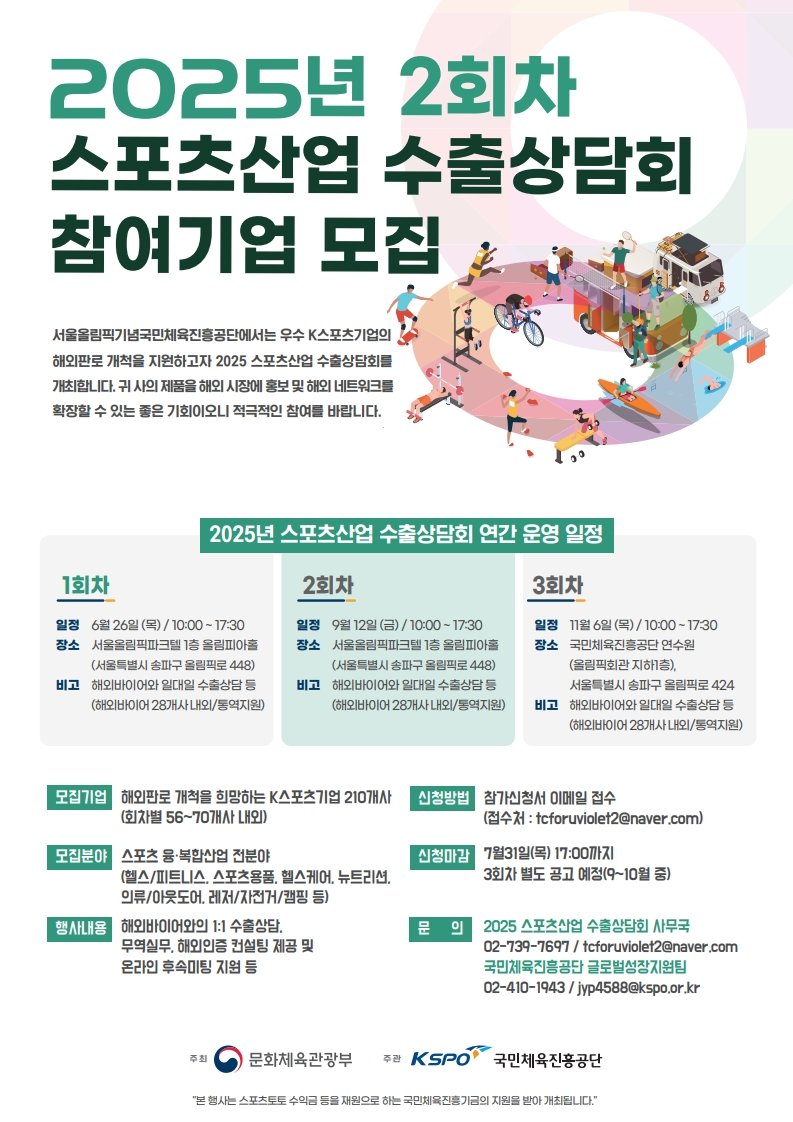 제2차 수출상담회에 참여를 희망하는 국내 스포츠 기업은 이달 31일 오후 5시까지 온라인(이메일)으로 신청할 수 있으며, 자세한 사항은 모집 공고문과 스포츠산업지원 누리집(spobiz.kspo.or.kr)에서 확인하면 된다.