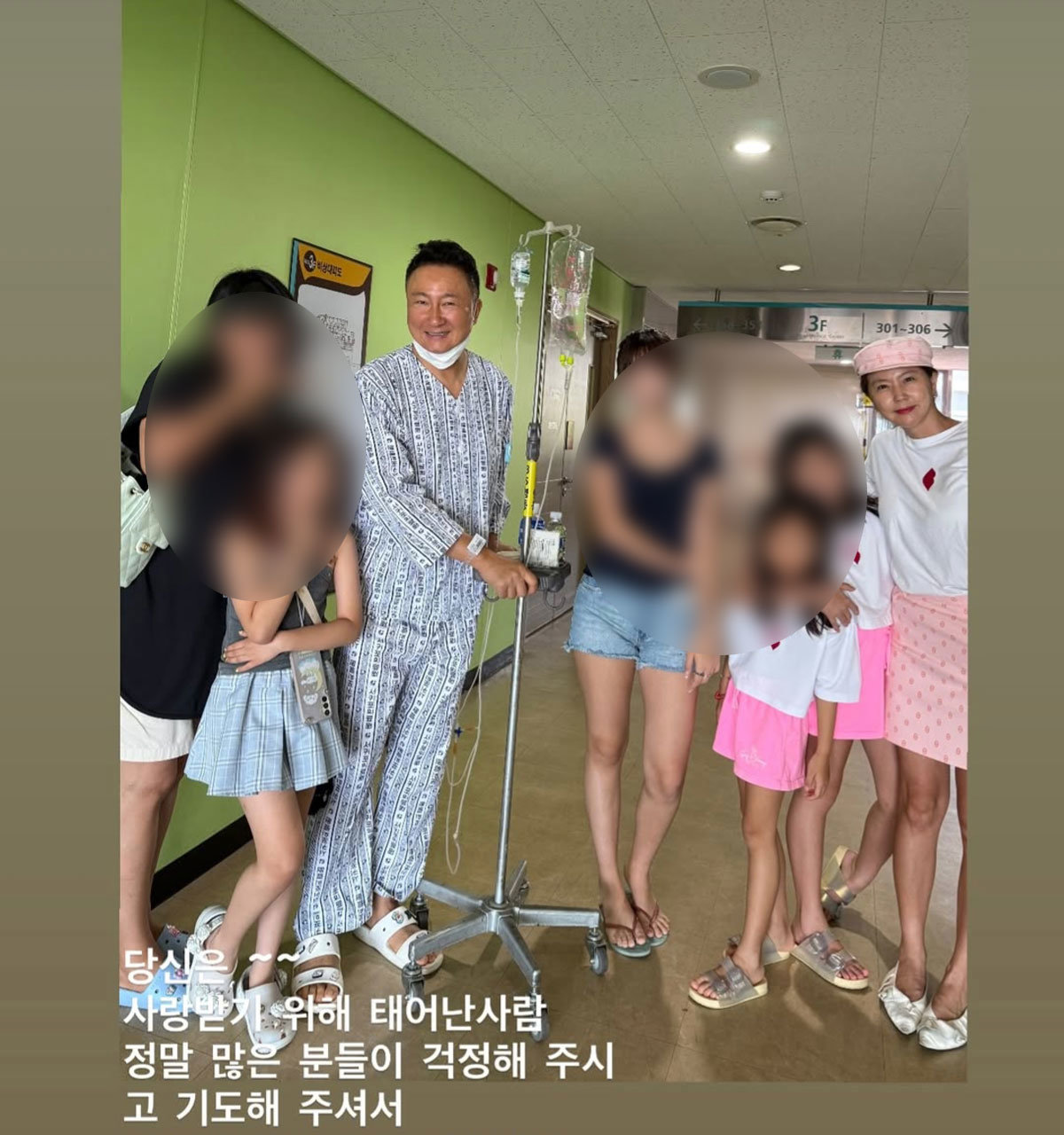 공개된 사진 속 주영훈 환자복을 입고 가족들 사이에서 미소를 되찾은 모습이다.