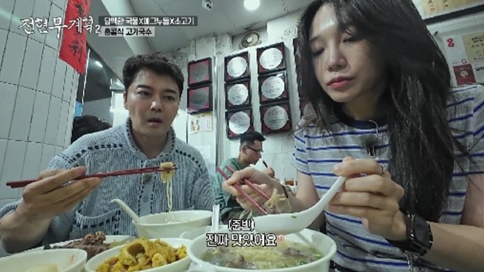 알고 보니 이들은 전날 늦은 오후 홍콩에 도착했으며, 이중 전현무-곽튜브가 홍콩의 번화가인 코즈웨이베이 근처에서 먼저 홍콩 먹트립을 시작했던 것. 전현무는 “홍콩에서의 첫끼는 한국 방송에서 최초로 소개하는 찐 로컬 맛집으로 갈 것”이라며 ‘홍콩 소고기 국수’로 유명한 식당으로 향했다. 해당 식당은 이미 문전성시를 이루고 있었고, 두 사람은 사장님에게 조심스레 섭외 요청을 했다. 사장님은 쿨하게 승낙했고 이에 두 사람은 장시간 웨이팅을 하다 드디어 식당에 들어섰다. 직후 이들은 한쪽 벽에 걸려 있는 11개의 ‘미슐랭 가이드’ 액자를 보고 깜작 놀랐다. 뒤이어 시그니처 메뉴인 새하얀 무찜을 맛봤는데, 곽튜브는 “딱 한국인이 좋아하는 맛이다!”라며 찐 감탄했다.