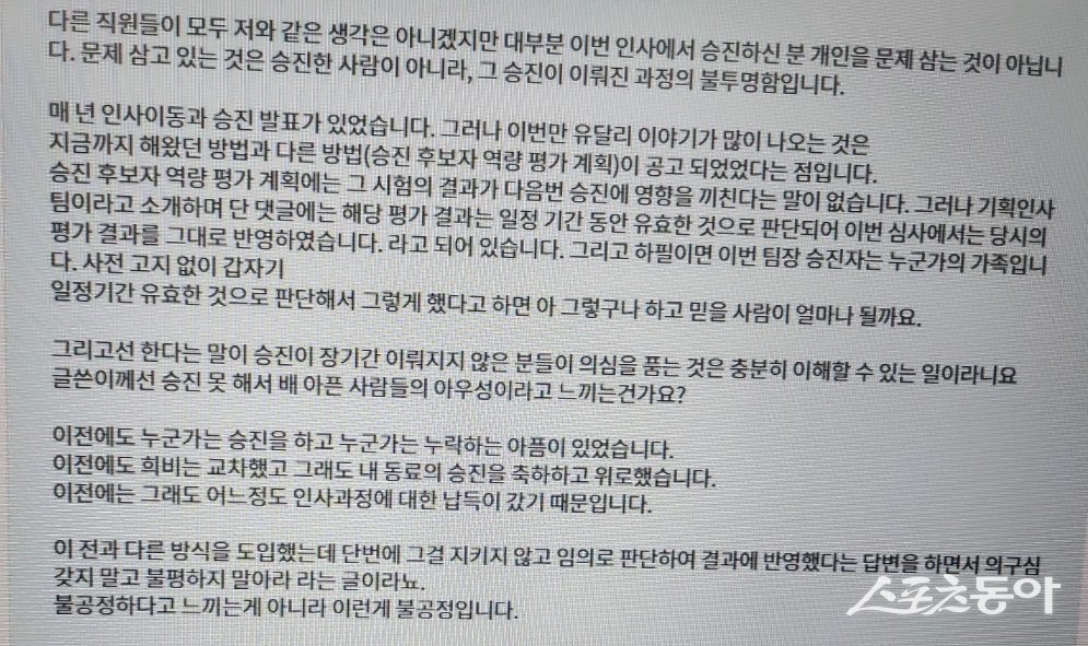 이에 대해서도 내부 게시판을 통해 문제 제기가 이어졌다. 인사팀 관계자는 “2월에 실시한 승진시험의 결과가 일정 기간 유효하므로 별도 절차 없이 승진시킬 수 있다”고 해명했다.