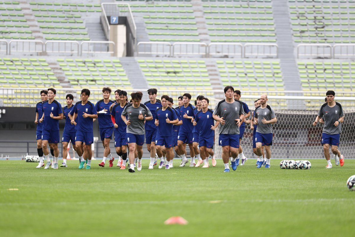 축구국가대표팀 선수들이 6일 성남종합운동장에서 가볍게 뛰며 몸을 풀고 있다. 사진제공|대한축구협회