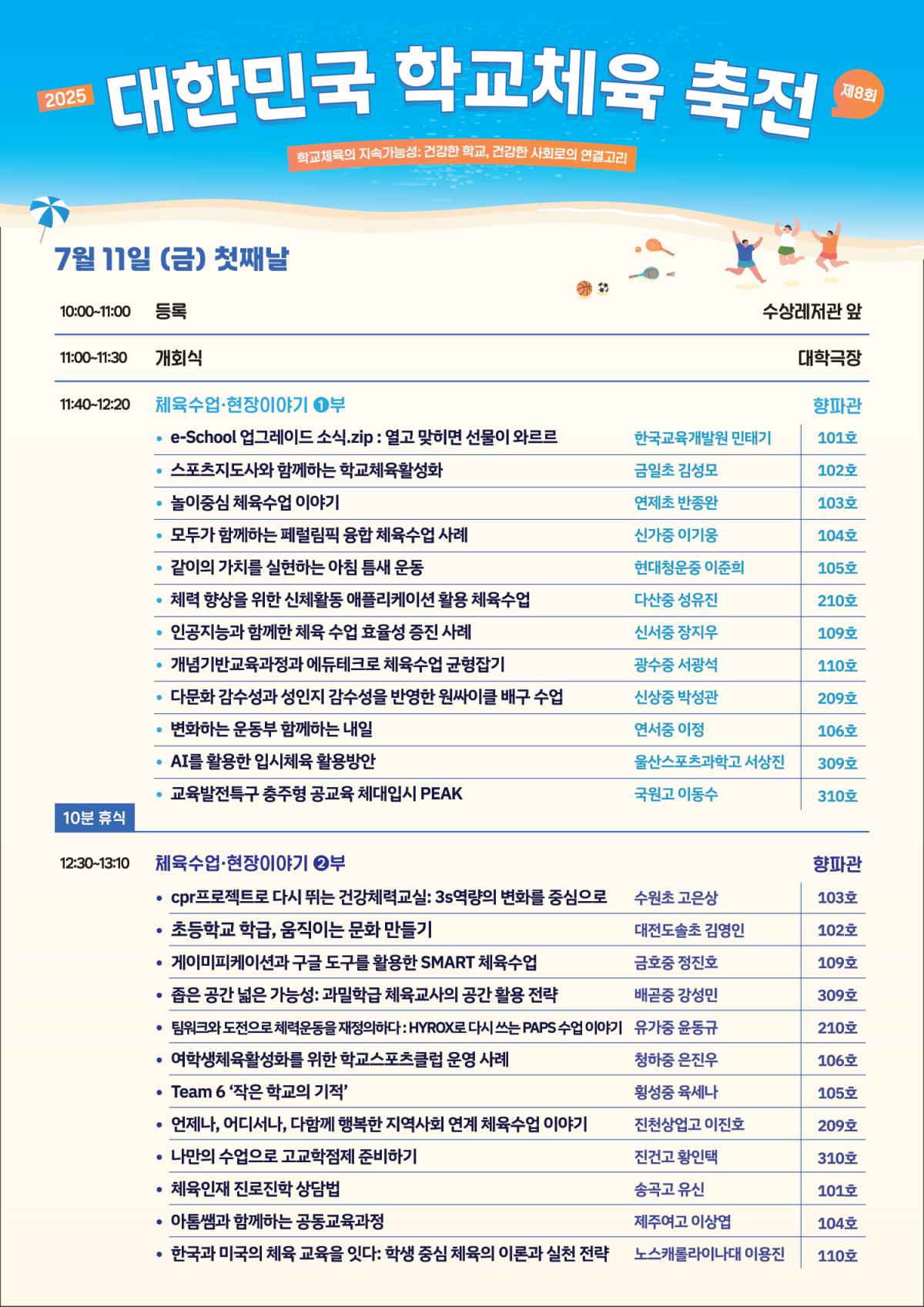 교육부, 17개 시도교육청, 학교체육진흥회(이사장 강은희)는 7월 11일(금)부터 12일(토)까지, 부경대학교 대연캠퍼스(부산)에서 ‘2025 제8회 대한민국 학교체육 축전’을 개최한다.현장 사례 공유, 다양한 실기 종목 지도법 등 체육교사 전문성 강화
