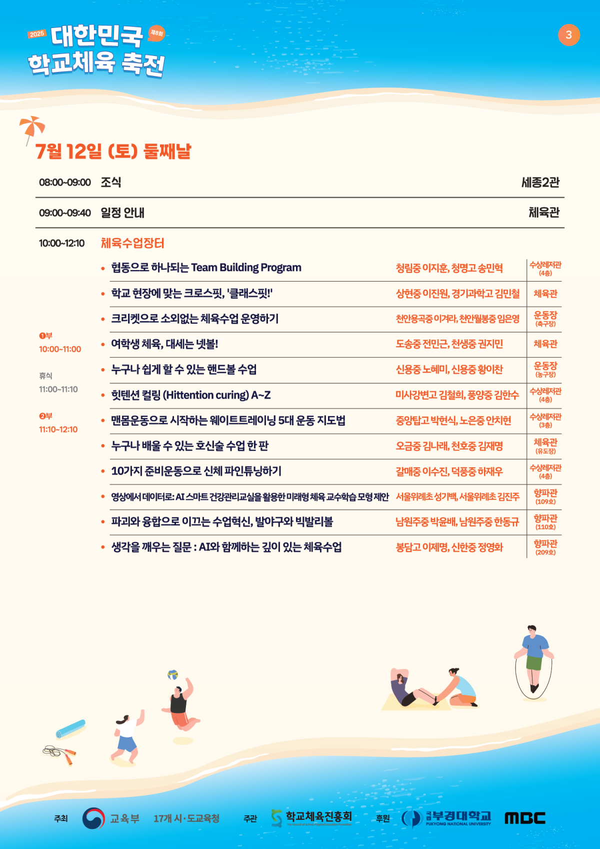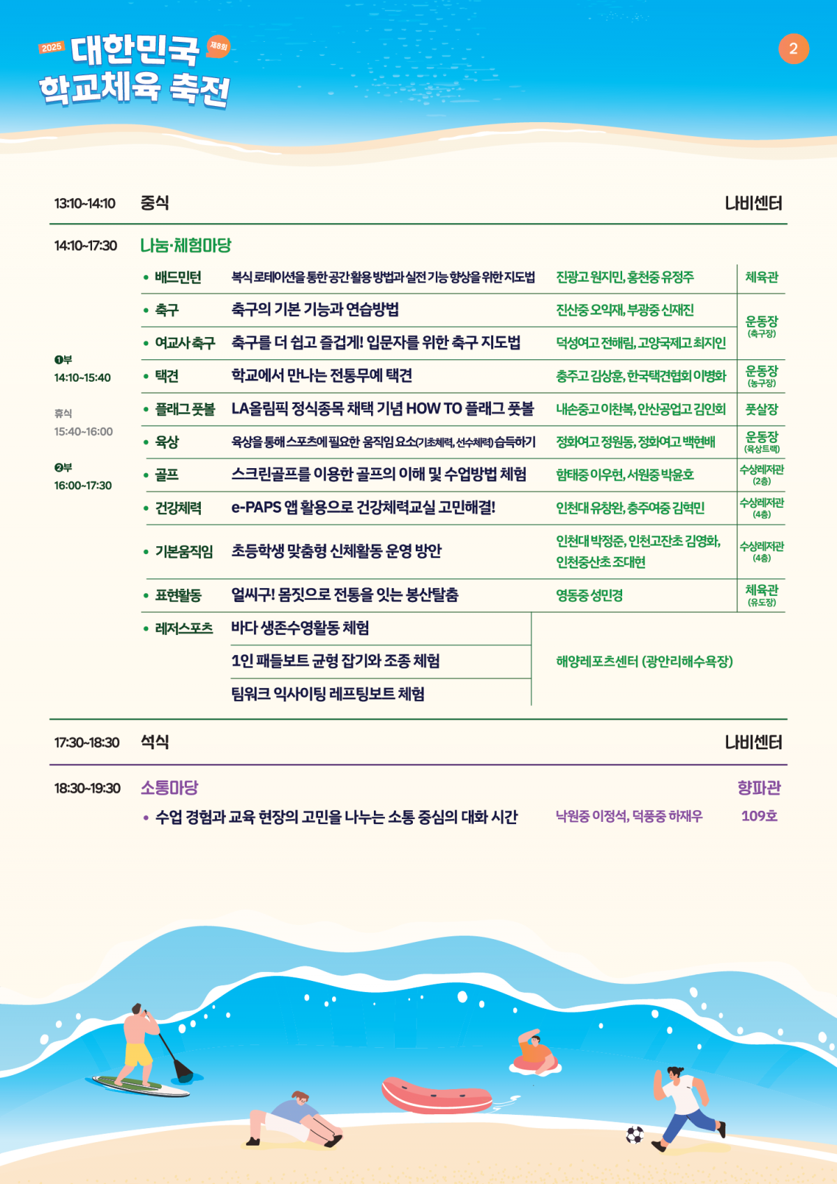 첫째 날인 11일에는 ‘체육수업 및 현장이야기’ 프로그램을 통해 현직 교사들의 생생한 수업 사례와 경험을 공유하며 효과적인 수업과 활동에 대한 아이디어를 나눈다. 이어지는 ‘나눔 및 체험마당’에서는 배드민턴, 축구, 택견 등의 실기 수업과 함께 광안리해수욕장에서 생존수영, 패들보트 등 다양한 해양 레포츠 프로그램도 운영된다.