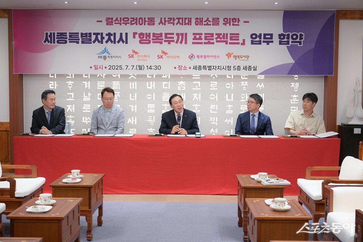 이날 협약식에는 ▲최민호 세종시장 ▲송창록 SK㈜머티리얼즈 대표 ▲박용우 SK바이오텍㈜ 대표 ▲조민영 행복나래㈜ 본부장 ▲최준 행복도시락사회적협동조합 사무국장이 참석해, 민관 협력 기반 아동복지 강화를 약속했다.