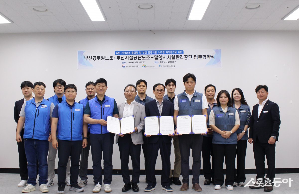 부산지역 공공기관 노동조합 두 곳과 밀양시시설관리공단이 지난 4일 오후 상호협력을 위한 업무협약을 체결했다.