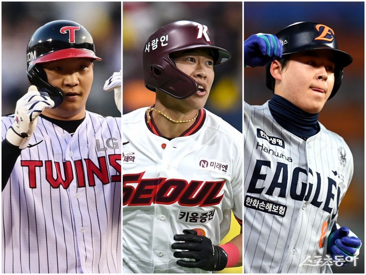 지난 시즌 ‘춘추전국시대’를 방불케 한 3루수 경쟁 구도가 올 시즌에는 LG 문보경, 키움 송성문, 한화 노시환(왼쪽부터)의 3파전으로 압축된 분위기다. 스포츠동아DB