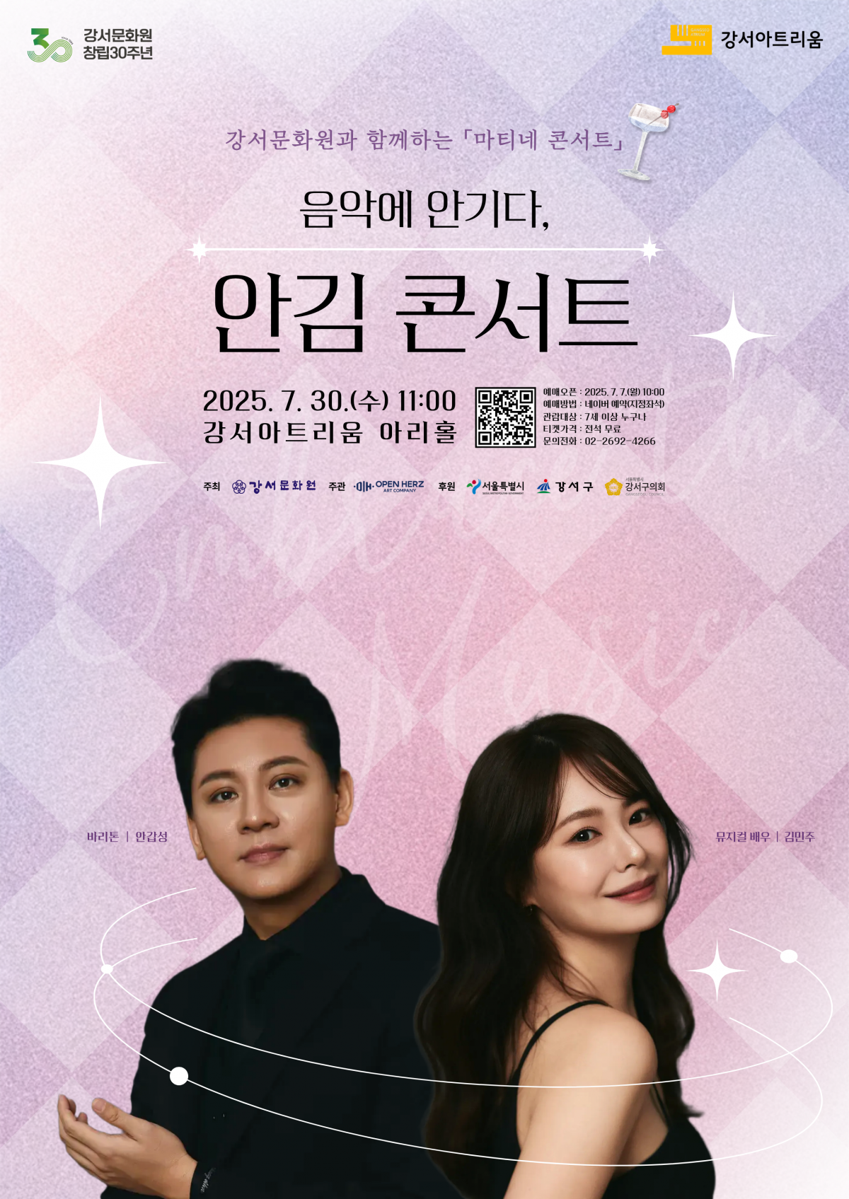 강서문화원(원장 김진호)의 기획공연 ‘음악에 안기다, 안김 콘서트’가 7월 30일 수요일 오전 11시, 강서아트리움 아리홀에서 열린다.