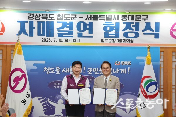 청도군(군수 김하수)과 서울특별시 동대문구(구청장 이필형)가 10일 자매결연 협정식을 체결하고, 양 지역 간의 지속 가능한 상생협력 기반을 공식적으로 마련했다.