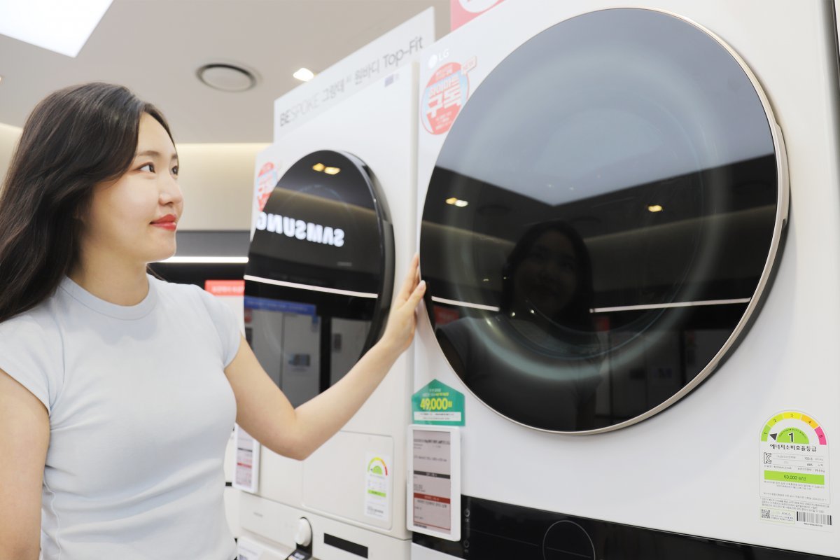 ‘으뜸효율 가전제품 환급 사업’ 대상 상품인 세탁건조기를 고르고 있는 모델. 사진제공|롯데하이마트