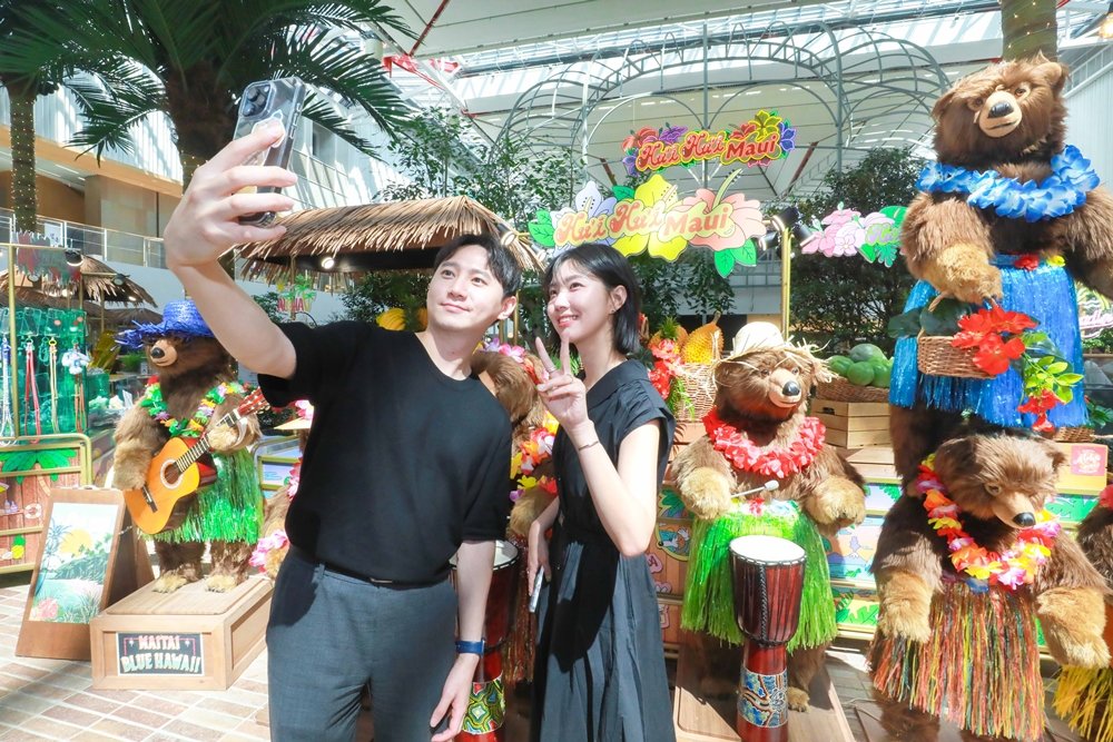 서울 여의도 소재 더현대 서울이 8월 17일까지 5층 실내 정원 사운즈포레스트에서 하와이의 마우이섬 콘셉트의 이색 공간 연출을 선보인다. 전국 점포에서 진행 중인 ‘후이 후이 마우이’ 여름 테마 행사의 핵심 콘텐츠다. 최대 7.5m 높이의 야자수 10여 그루가 둘러싸고 있는 공간에서 하와이풍 상점을 즐길 수 있다. 또 꽃목걸이를 둘러매고 춤을 추는 곰인형 등 다양한 포토존을 마련했다. 사진제공|현대백화점