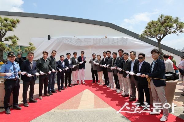 포항시가 송도바다시청 준공 현판 제막식에서 컷팅식을 준비하고 있는 모습. 사진제공ㅣ포항시