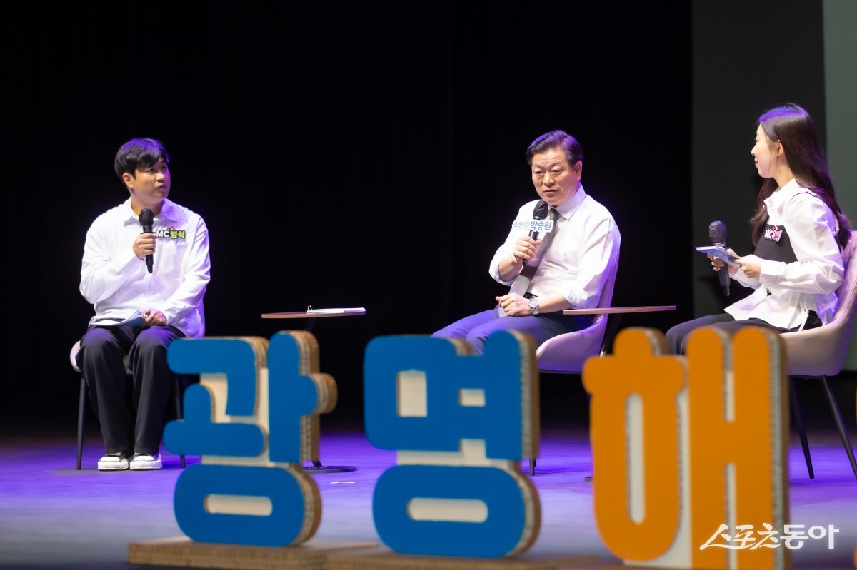 박승원 광명시장(사진 가운데)이 지난 12일 광명시민회관에서 열린 ‘공감콘서트’에서 시민들과 소통하고 있다. 사진제공|광명시