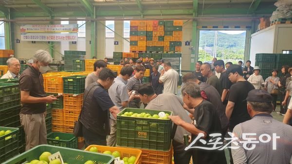 풍기농협 공판장에서 아오리 사과 경매가 진행되고 있는 모습. 사진제공ㅣ영주시