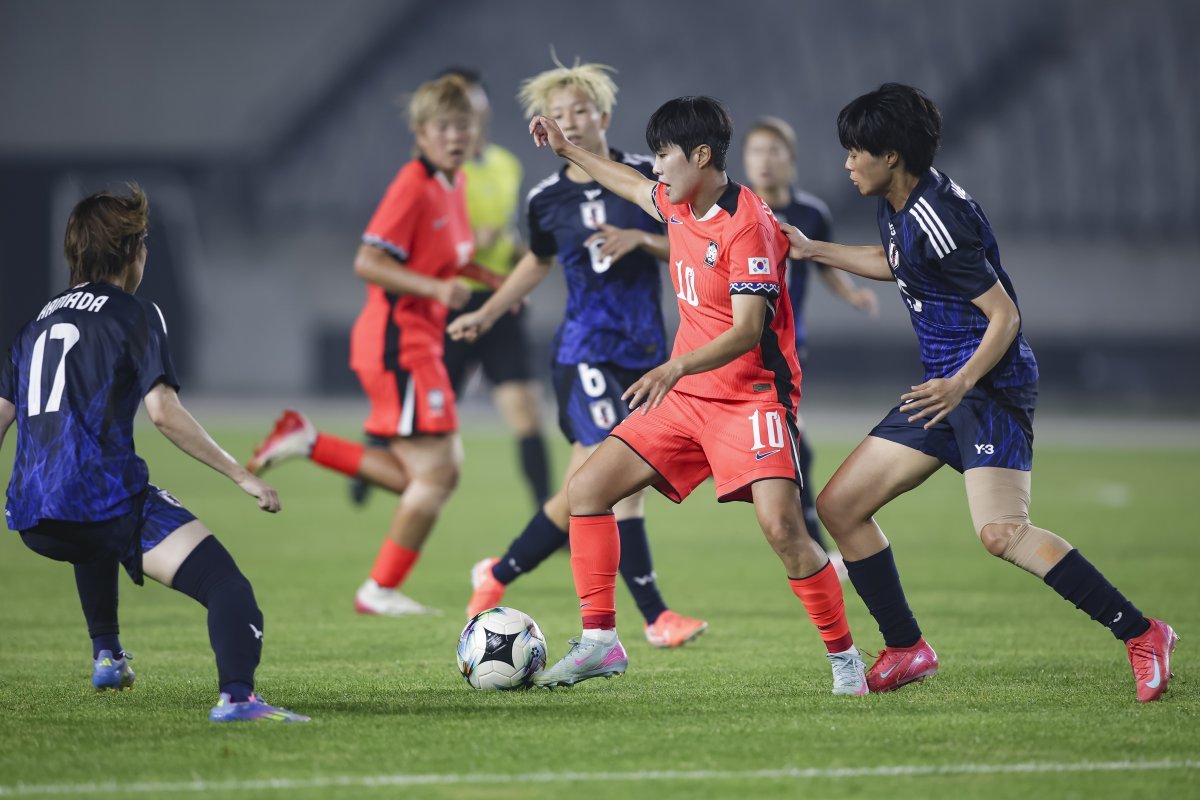 신상우 여자축구대표팀 감독은 지난해 10월 부임 후 고강도 훈련 기조를 이어가고 있다. 베테랑들도 고강도 훈련이 세계무대와 간극을 좁힐 수 있는 수단이라며 지지를 보내고 있다. 사진은 13일 화성종합경기타운에서 열린 일본과 2025 EAFF E-1 챔피언십 2차전에서 드리블을 하고 있는 지소연(10번). 사진제공│대한축구협회