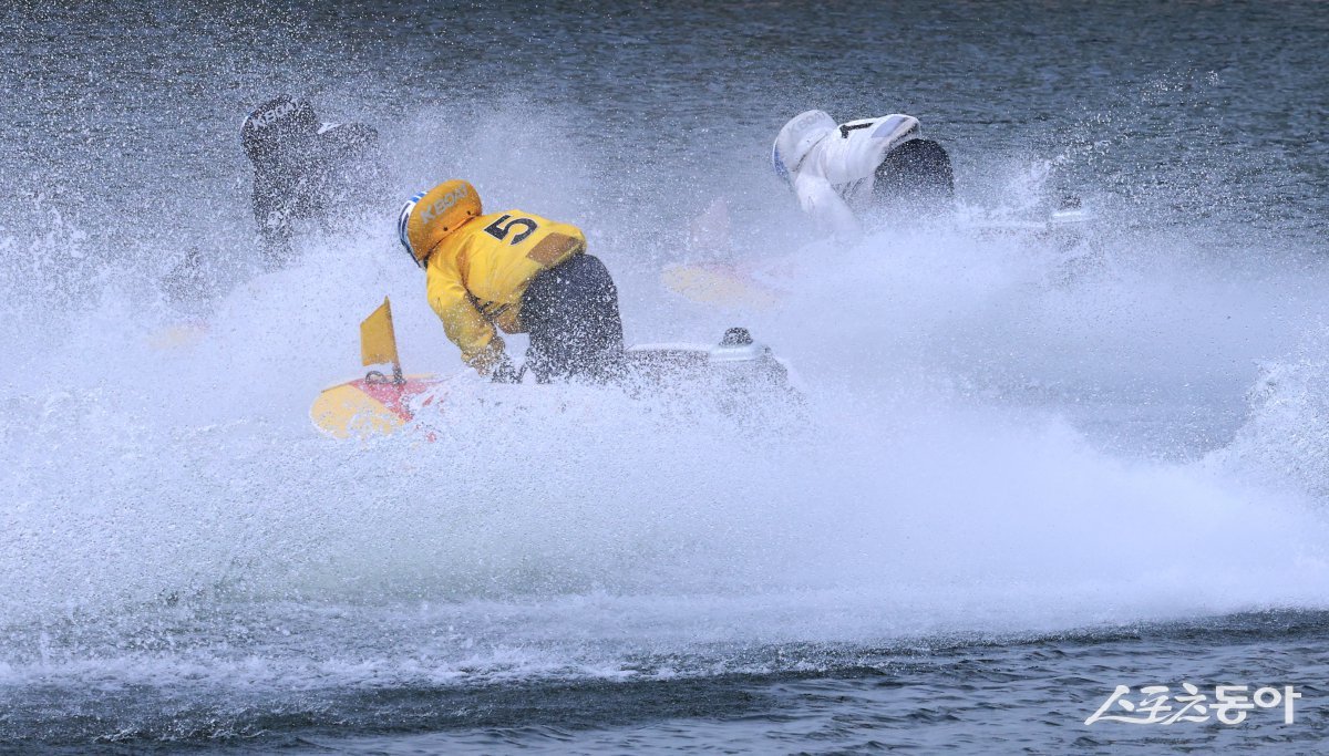 미사경정장에서 선수들이 거센 물보라를 일으키며 턴마크를 돌고 있다. 사진제공 | 국민체육진흥공단