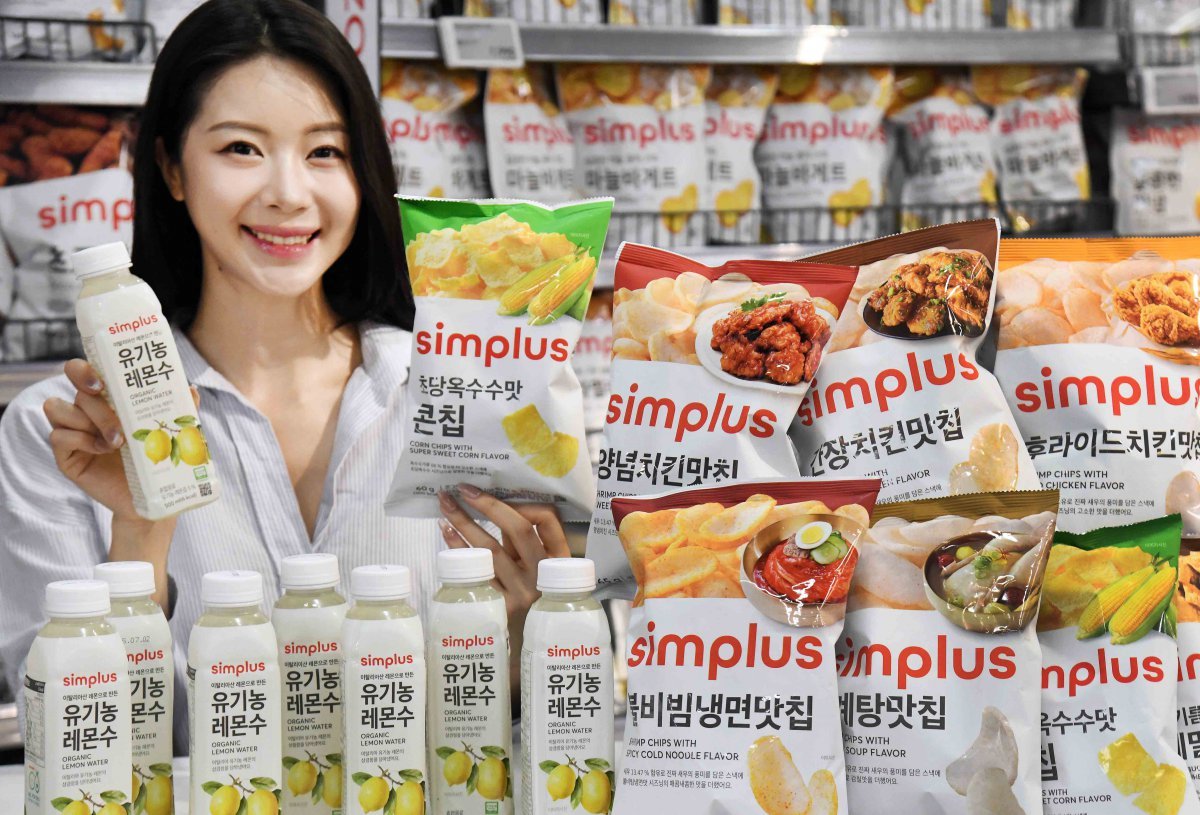 스낵의 경우, ‘삼계탕맛칩’, ‘불비빔냉면맛칩’, ‘후라이드치킨맛칩’, ‘양념치킨맛칩’, ‘간장치킨맛칩’, ‘들기름비빔막국수맛메밀칩’, ‘초당옥수수맛콘칩’ 등으로 구성했다. 또 상큼한 이탈리아 유기농 레몬을 담은 ‘심플러스 유기농 레몬수’도 선보였다. 가격은 모두 1000원이다. 사진제공|홈플러스