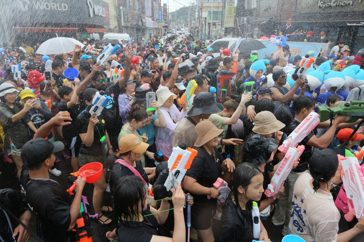 ‘정남진 장흥물축제’에서 가장 인기높은 축제 하이라이트 지상 최대의 물싸움. 매일 오후 2시부터 3시까지 진행한다 사진제공|장흥군