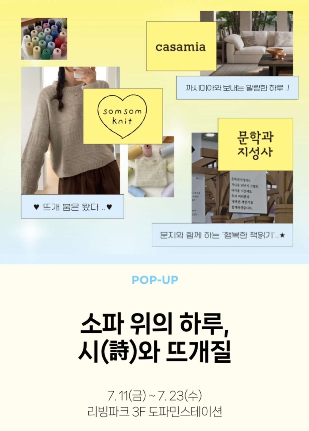 ‘소파 위의 하루, 시(詩)와 뜨개질’ 이라는 주제로 MZ세대 사이에서 그랜마코어 트렌드로 큰 인기를 얻고 있는 ‘뜨개질’, 셀프 디깅의 대표 콘텐츠 ‘독서’, 편안한 소파와 테이블로 꾸며진 ‘힐링존’ 등 3가지 각기 다른 카테고리를 하나의 팝업스토어로 풀어냈다.