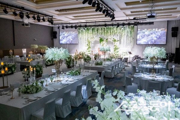 ‘믹스 플라워 웨딩’은 생화와 조화를 조화롭게 구성한 풍성한 스타일링이 특징이다. 천고 6m의 웅장한 공간에 행잉 장식, 무대, 입구, 버진로드, 센터피스, 포토테이블 등 주요 공간 전체를 아우르는 플라워 데코레이션이 더해지며 특히 신부대기실에는 100% 생화 장식이 적용돼 자연의 싱그러움과 세련된 감각을 더했다.