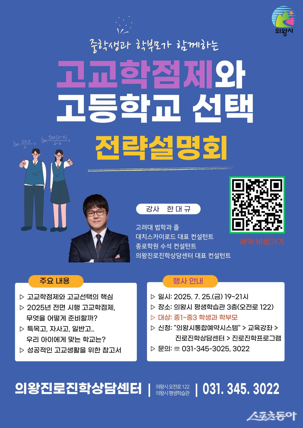 설명회 강사로는 의왕진로진학상담센터의 대표 컨설턴트이자 ‘미래부모학교’, ‘찾아가는 진로진학 프로그램’ 등에서 큰 호응을 얻고 있는 한대규 강사가 나선다. 그는 다년간의 진학 컨설팅 경험을 바탕으로 학생과 학부모에게 실질적인 정보를 제공할 예정이다.