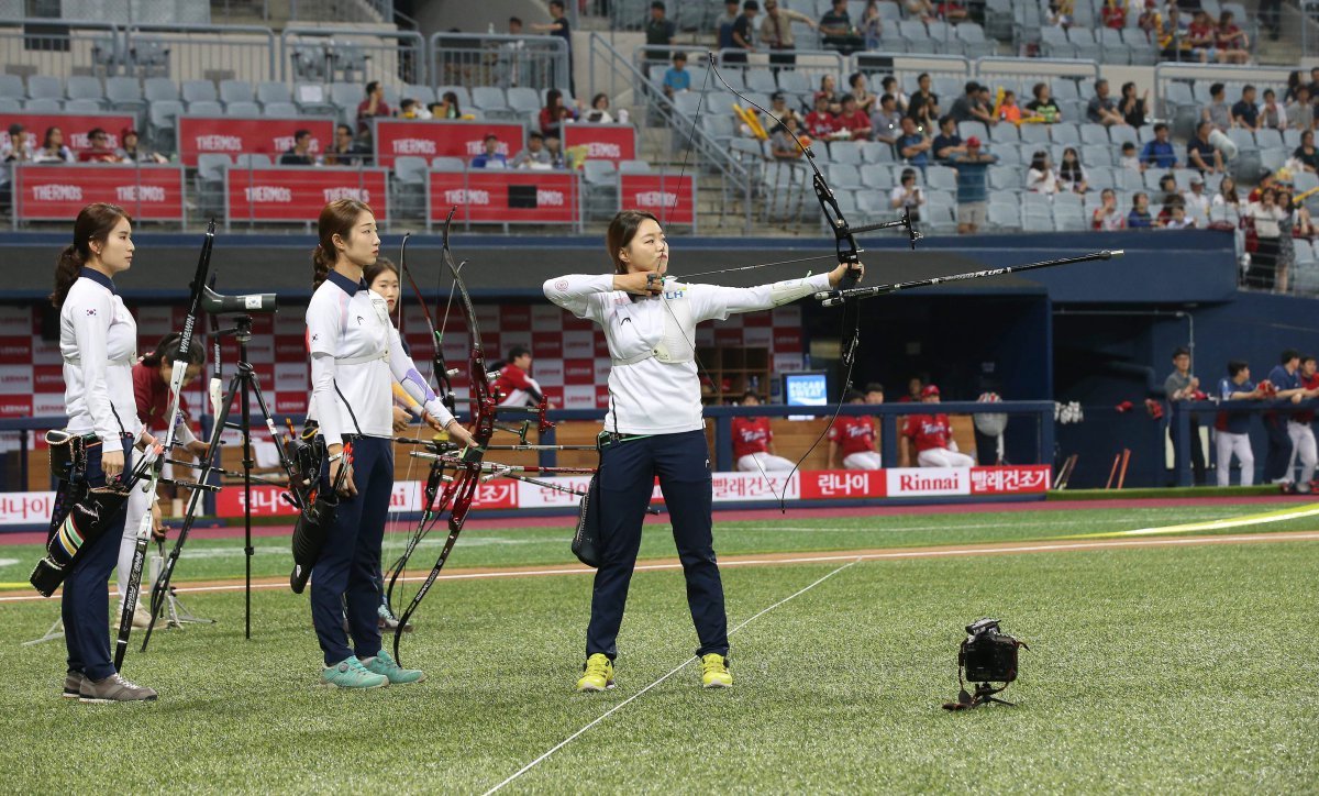 양궁국가대표팀이 9월 광주에서 열릴 2025세계양궁선수권대회를 대비하고자 올해도 야구장 훈련을 실시한다. 2000시드니올림픽을 앞두고 처음으로 시작된 이 훈련은 선수들의 집중력과 담력을 키우는 데 큰 도움이 됐다. 사진은 2016리우데자네이루올림픽을 앞두고 그해 7월 3일 고척 KIA-넥센 경기에서 야구장 훈련을 한 여자양궁대표팀 선수들. 스포츠동아DB