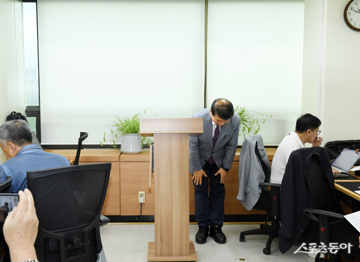 백경현 시장은 22일 구리시청 본관 4층 기자실에서 최근 언론을 통해 논란이 된 비상근무 중 지역 단체 야유회 참석에 대해 머리 숙여 사과를 하고 있다. 사진제공ㅣ구리시