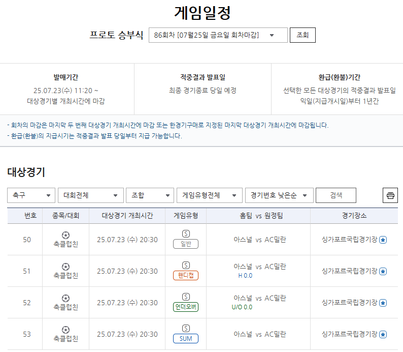 서울올림픽기념국민체육진흥공단(이사장 하형주)이 발행하는 체육진흥투표권 스포츠토토의 수탁사업자 한국스포츠레저㈜가 오는 7월 23일(수) 오후 8시 30분(한국시간) 싱가포르 국립경기장에서 열리는 아스널(홈)-AC밀란(원정)전을 대상으로 한 프로토 승부식 86회차 게임을 발매한다고 밝혔다. 일반, 핸디캡, 언더오버, SUM 등 4개 유형으로 발매…유럽 명문 팀들의 대결에 해외축구팬 이목 집중