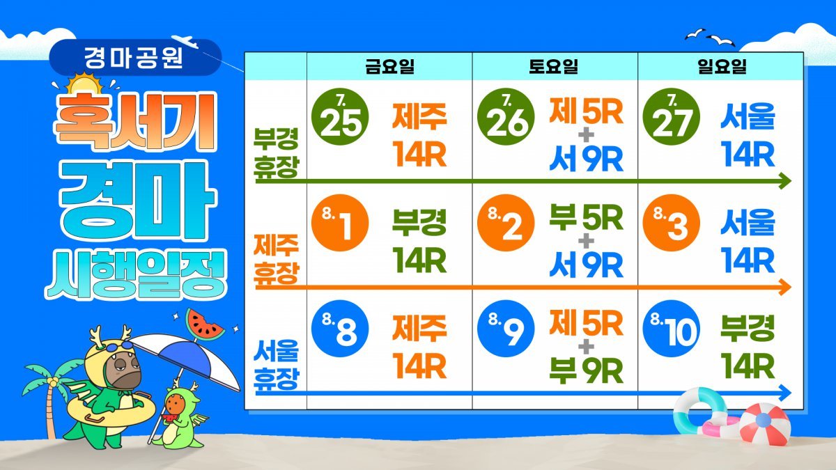휴장 첫 주자인 렛츠런파크 부경은 7월 마지막 주 숨 고르기에 들어간다. 이어 8월 첫째 주에는 제주, 둘째 주에는 서울이 휴장에 들어간다. 해당 기간 중 중계 발매는 진행되므로 고객 입장이 가능하며, ‘더비온’을 통해 온라인 마권 구매도 가능하다.