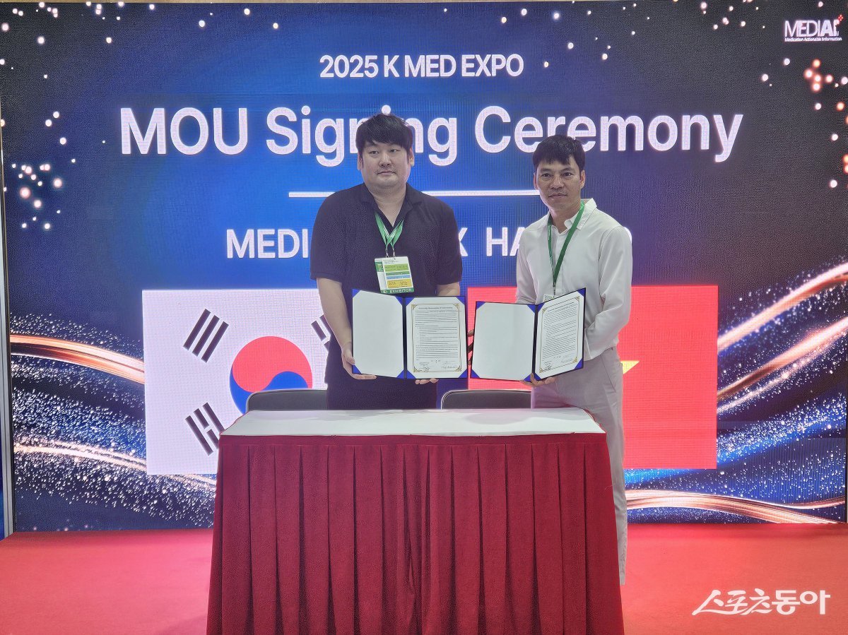 2025년 베트남 K 의료기기 전시회에서 헬스케어 데이터 기반 임상시험 플랫폼 기업인 ㈜메디아이플러스가 베트남 의료기기 수입·유통업체인 HANMED와 업무협약(MOU)을 체결하고 있다. 사진제공ㅣ성남시