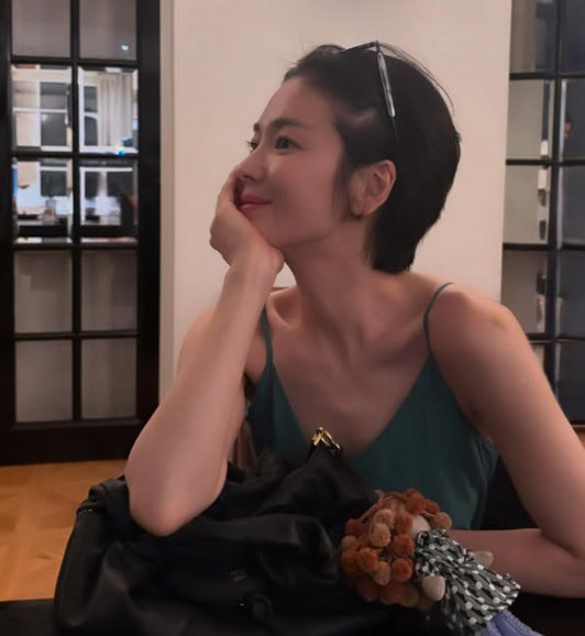 송혜교는 23일 지인들과 함께 식사하고 대화하며 남긴 여유로운 일상 사진을 공개했다. 사진 속 그는 슬립 스타일의 초록색 상의에 검은색 와이드 팬츠를 매치해 스타일리시한 패션을 완성했다. 귀여운 키링을 더한 백과 선글라스를 더해 시크하면서도 힙한 느낌을 자아냈다.