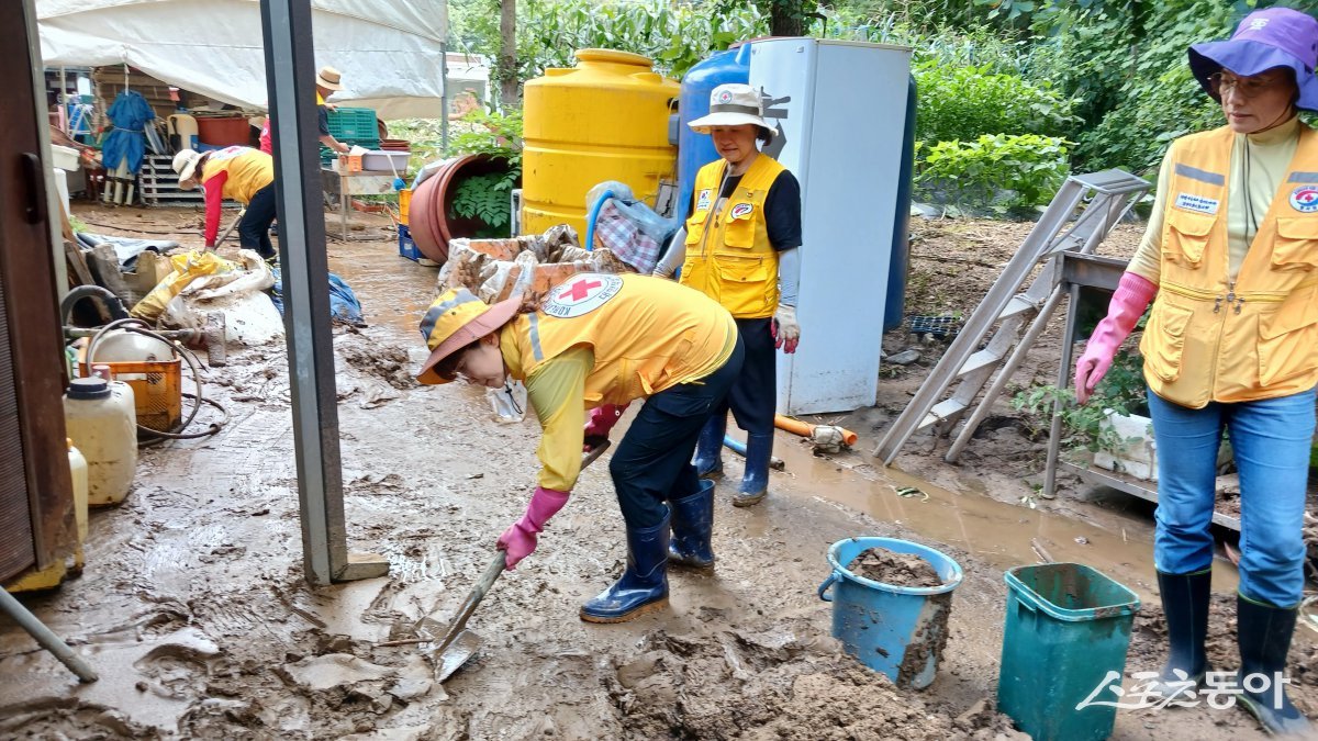 폭염 속에 가평 수해 복구에 외부 자원봉사 손길 절실한 상태에 봉사하는 적십자 회원들 사진제공ㅣ가평군