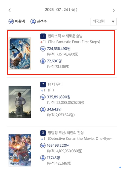 24일 개봉한 ‘판타스틱 4: 새로운 출발’은 영화관입장권 통합전산망 기준 72,690명의 관객을 동원하며 외화 박스오피스 1위를 차지했다. 이어 25일 오전 7시 기준 실시간 예매율에서도 외화 부문 1위, CGV 예매율 1위를 기록하며 압도적인 흥행 기세를 이어가고 있다. CGV 골든에그지수는 91%를 기록, 관객 만족도 또한 높은 수준을 유지 중이다.