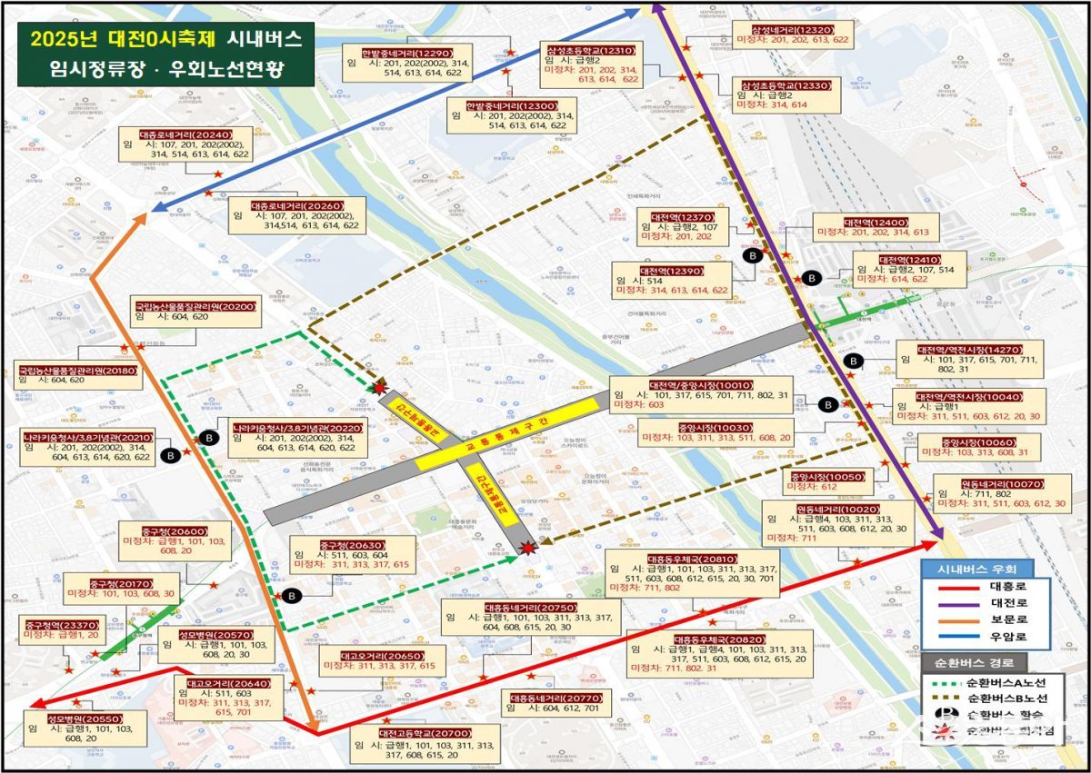 우회 노선 및 임시 정류장 위치 등의 구체적인 정보는 대전교통정보센터와 ‘대전 0시 축제’ 공식 홈페이지에서 확인할 수 있다.