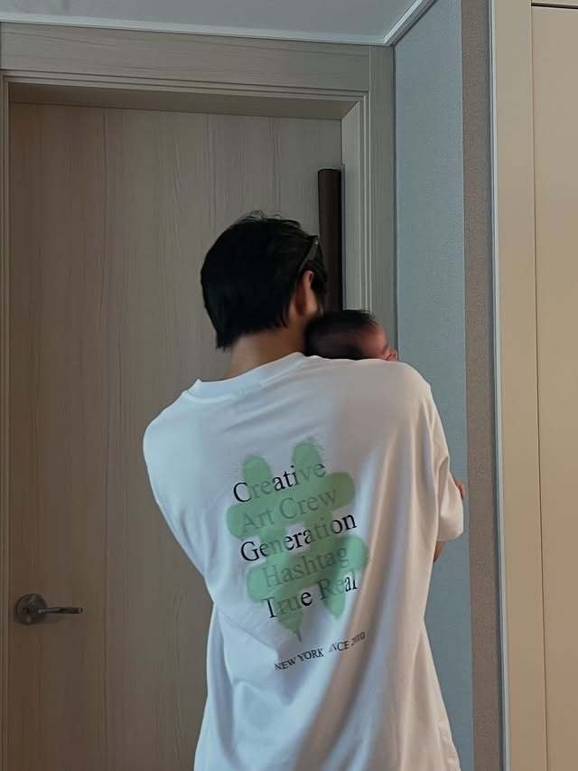 신재하는 흰 티셔츠에 수수한 차림으로 조카를 안고 있다. 아기의 작고 귀여운 손이 성인 손가락을 꼭 잡고 있는 모습은 보는 이들로 하여금 미소를 짓게 만들었다.