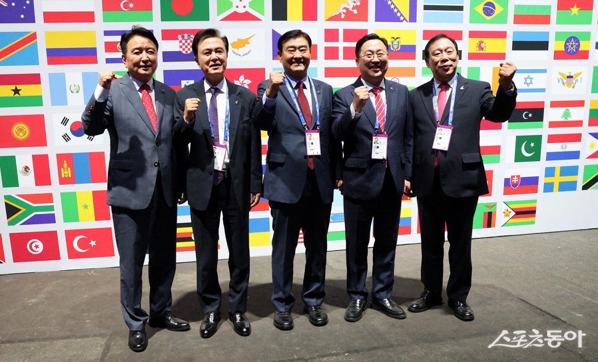 특히, 이 자리에서 김태흠 지사를 비롯해 이장우 대전시장, 최민호 세종시장, 김영환 충북도지사, 강창희 조직위원장이 함께 라인루르 조직위로부터 대회기를 공식 인수했다. 사진제공|충남도