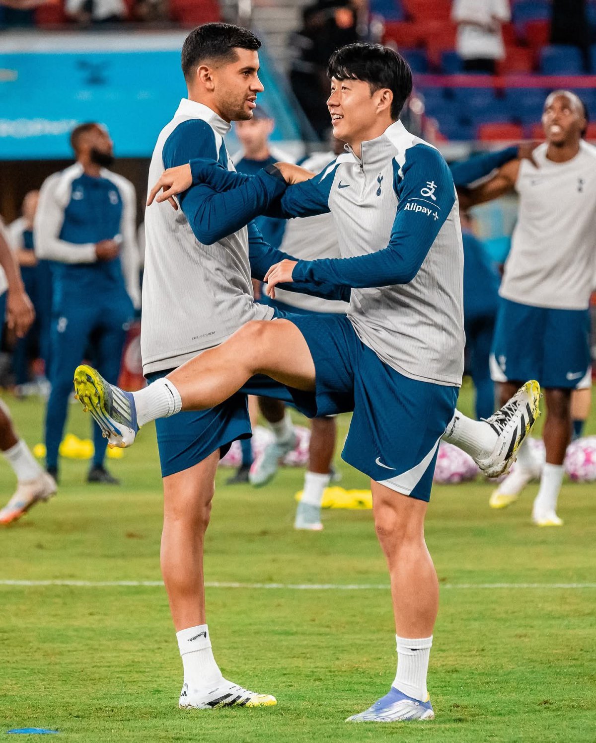 토트넘 주장 손흥민(오른쪽)과 부주장 크리스티안 로메로가 아스널과 프리시즌 ‘친선 북런던 더비’를 하루 앞둔 29일 홍콩 카이탁 스타디움에서 몸을 풀고 있다. 사진출처|토트넘 홋스퍼 페이스북