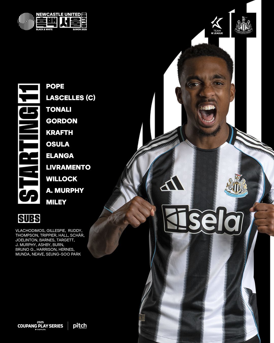 박승수가 벤치에서 출발하는 가운데, 뉴캐슬의 팀 K리그전 선발명단에는 주전 멤버들이 대거 포함됐다. 공격진은 안토니 엘랑가, 윌 오술라, 앤서니 고든이 구성한다. 중원은 산드로 토날리, 조 윌록, 루이스 마일리가 꾸린다. 수비수는 자말 러셀스, 티노 리브라멘토, 알렉스 머피, 에밀 크라프트가 선발로 나선다. 골키퍼 장갑은 닉 포프가 낀다.