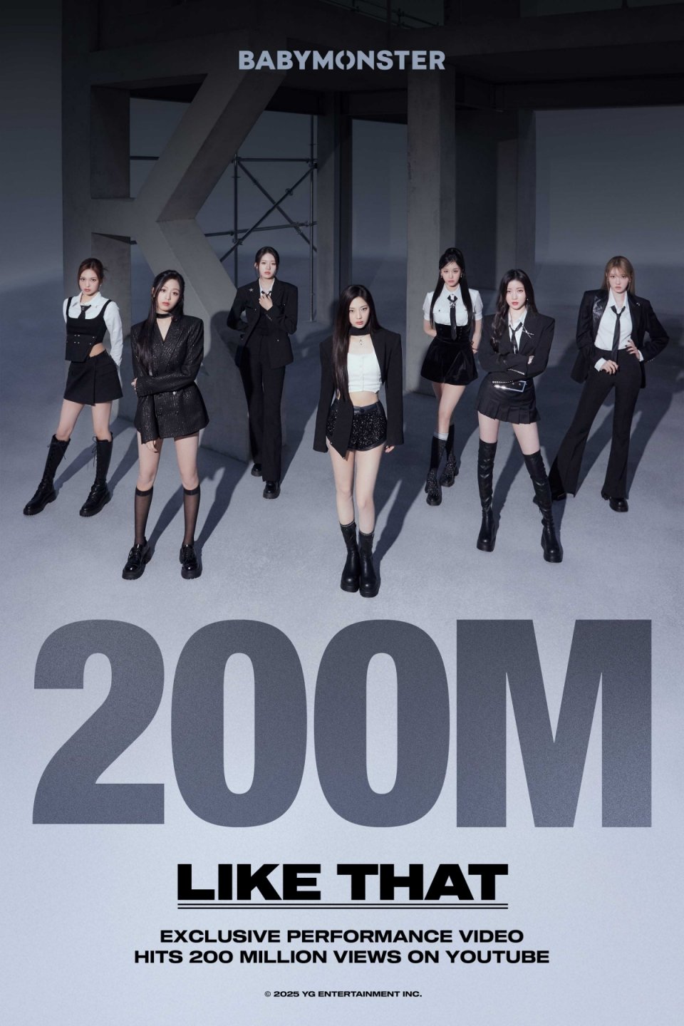 YG엔터테인먼트는 30일 베이비몬스터의 ‘LIKE THAT’ 익스클루시브 퍼포먼스 비디오는 이날 오후 2시 유튜브 조회수 2억 회를 돌파했다고 전했다. 지난해 5월 31일 공개 이후 약 1년 2개월 만이다.