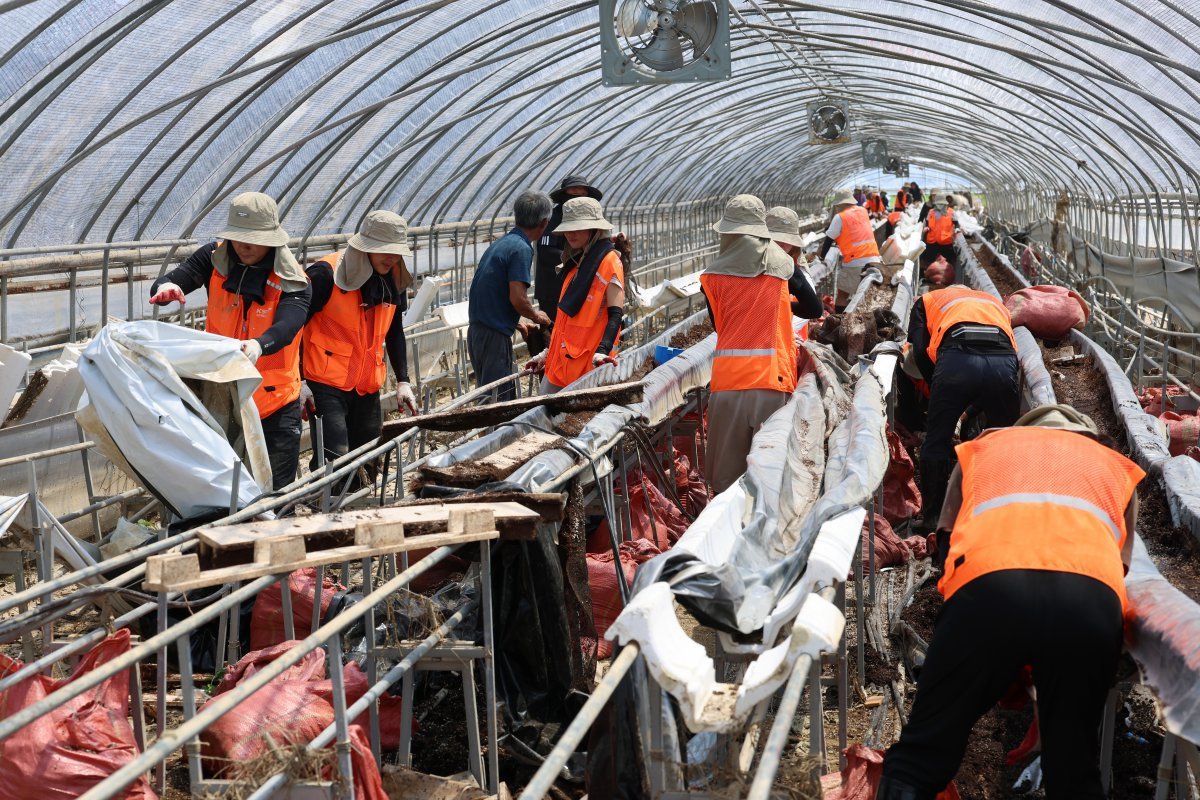국민체육진흥공단 봉사단원들이 딸기재배 비닐하우스에서 수해 피해복구를 위해 일손을 돕고 있다.