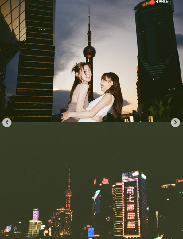 가수 츄와 아이들의 미연이 중국 상하이에서 우정 인증샷을 찍었다. 손을 꼭 잡고 같은 포즈로 몸을 기울인 두 사람 뒤로는, 붉고 보랏빛으로 물든 동방명주가 솟아올라 있다. 이대로 엽서로 만들어도 되겠다는 말이 절로 나올 풍경이었다.