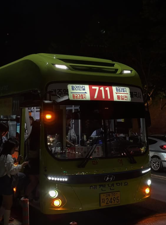 헤이즈가 올린 또 다른 사진엔 711번 버스가 등장한다. 초록빛 시내버스는 ‘동궁과 월지’라는 도착지를 네온처럼 밝히고 있었다. 이는 경주시내를 오가는 노선 중 하나로, 대중교통만으로도 동궁과 월지에 쉽게 도착할 수 있음을 보여준다.
