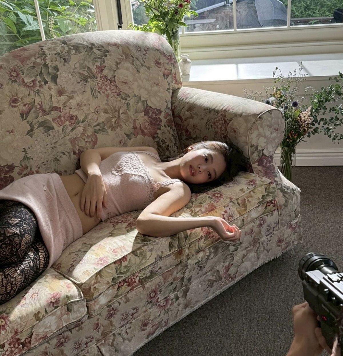 제니는 최근 SNS를 통해 여러 장의 비하인드 사진을 게재했다. 얇은 슬립에 니삭스를 매치한 스타일로, 고혹적인 분위기와 독보적인 몸매 라인을 드러냈다. 특히 누드톤 의상을 입고 소파에 누운 채 몽환적인 눈빛을 선보이며 시선을 사로잡았다.