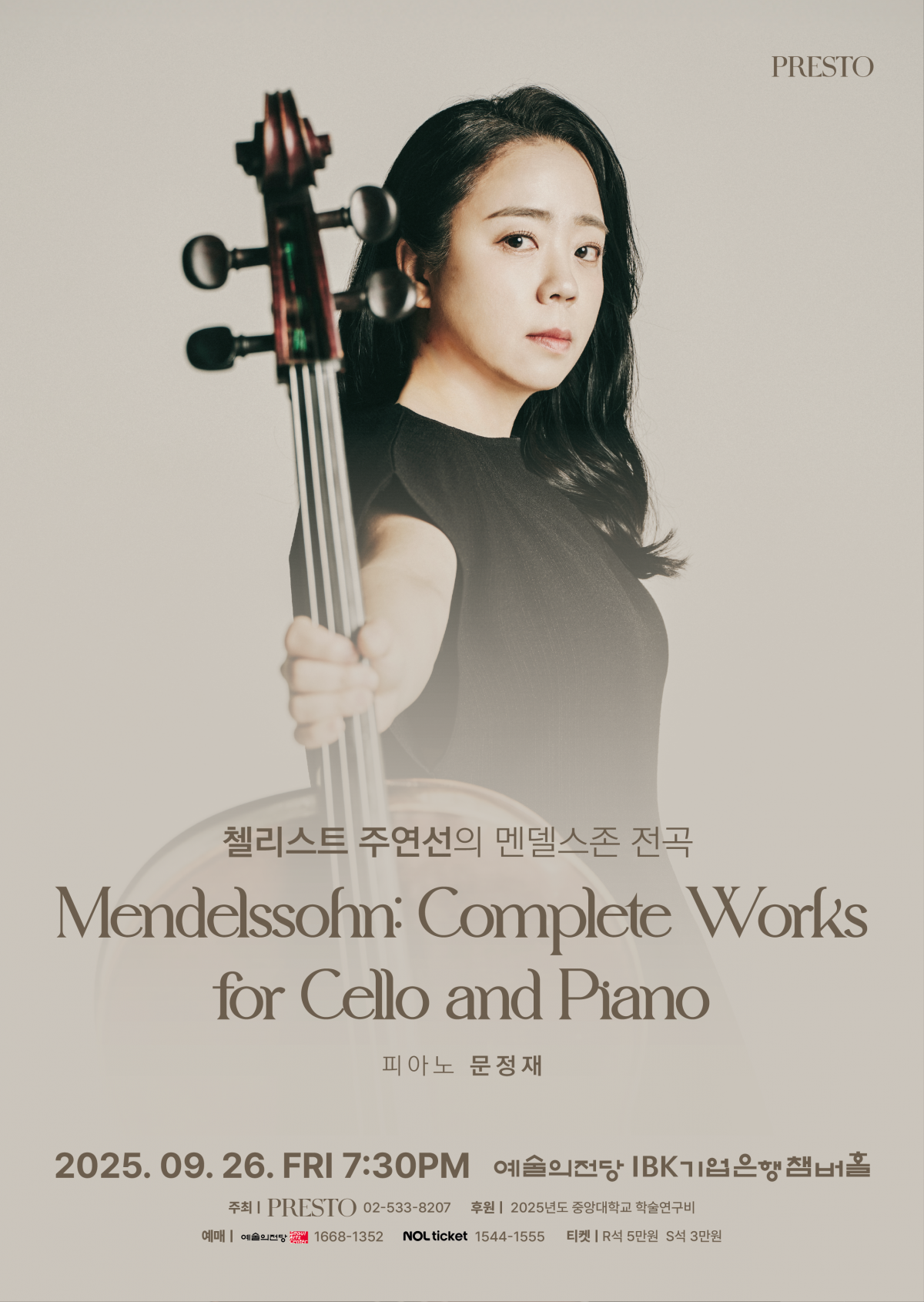 9월 26일 금요일 오후 7시30분, 서울 서초동 예술의전당 IBK기업은행챔버홀에서 첼리스트 주연선이 멘델스존의 첼로 작품 전곡을 무대에 올린다. 피아니스트 문정재와 함께하는 이번 공연은 멘델스존 특유의 서정성과 형식미, 그리고 첼로와 피아노가 주고받는 정교한 대화를 조명하는 무대다.