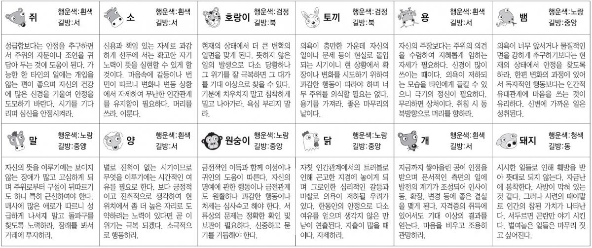 용띠 : 자신의주장보다는주위의의견을 수렴하여 지혜롭게 임하는자세가 필요하다. 신경이 많이쓰이는 때이다. 의욕이 저하되는 모습을타인에게들킬수있으니 극기의 정신이 필요하다.무리하면 상처이다. 취침 시 동북방향으로머리를향하라.