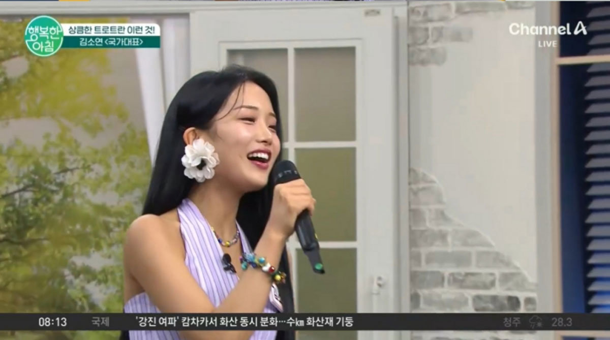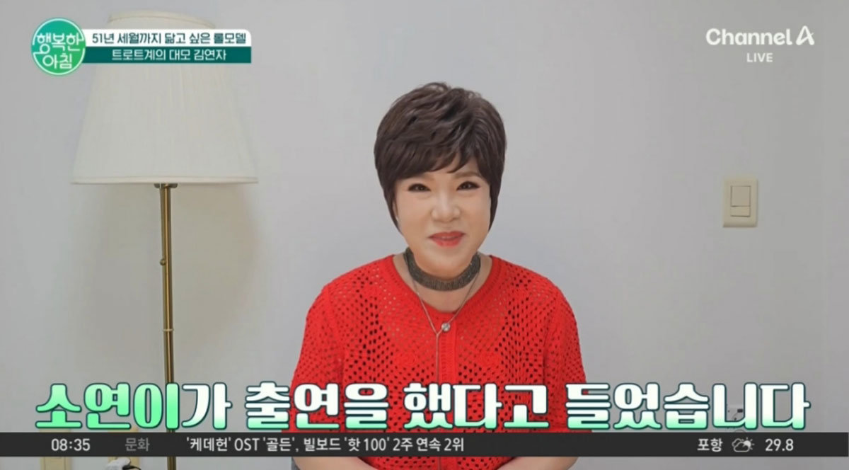 이와 함께 김소연은 ‘행복한 아침’을 위해 준비한 라이브 무대로 ‘국가대표’와 ‘오늘이 젊은 날’을 선보였다. 김소연의 화려한 꺾기와 구성진 가창력이 귀 호강을 선사했다.