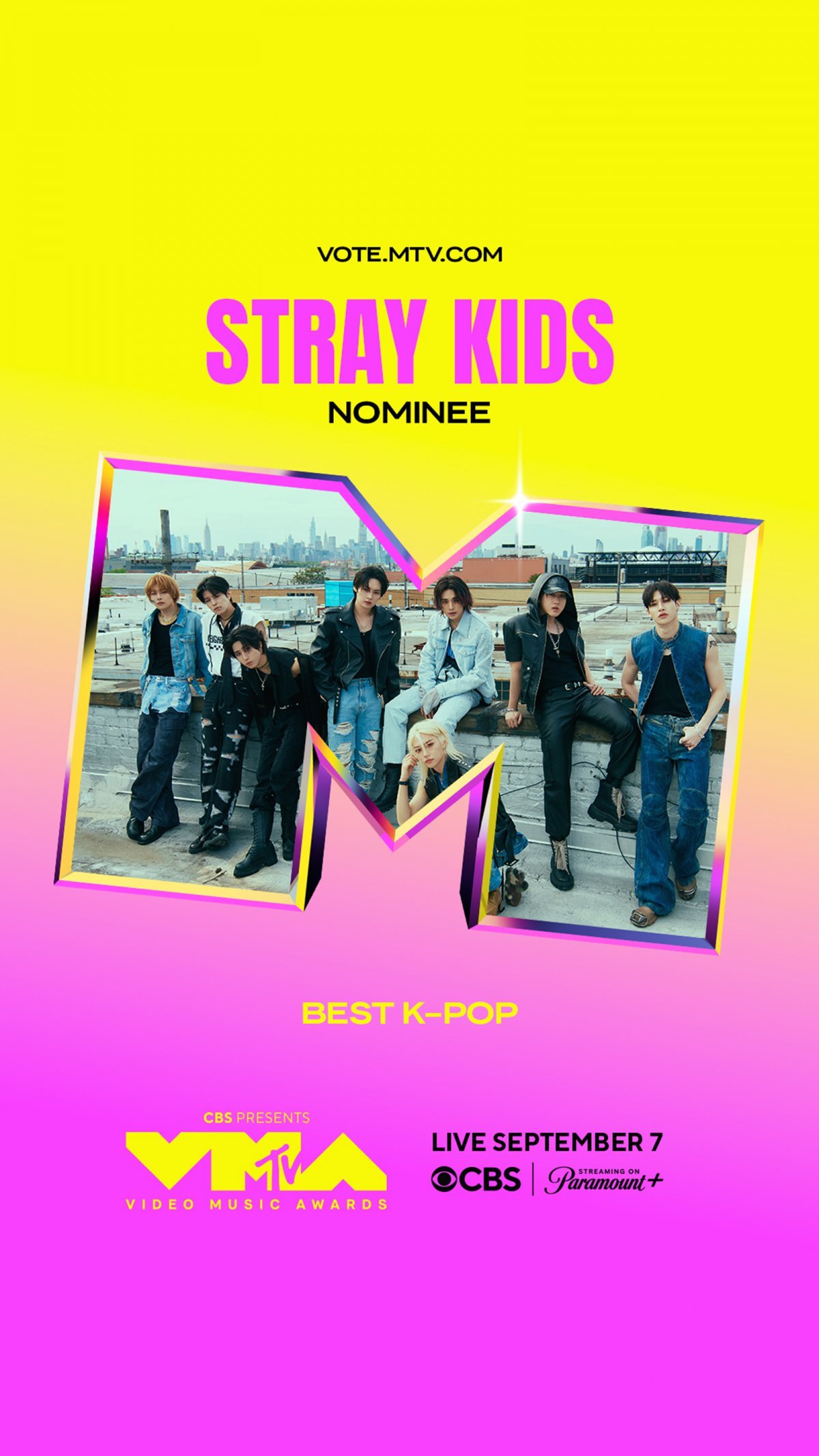 지난 5일(이하 현지시간) ‘MTV VMA’의 공식 홈페이지 및 SNS 채널 발표에 따르면, 스트레이 키즈는 2024년 7월 발매한 미니 앨범 ‘ATE’(에이트) 타이틀곡 ‘Chk Chk Boom’(칙칙붐)으로 ‘베스트 K팝’(Best K-Pop) 부문에 노미네이트됐다. 이들은 2022년 미니 앨범 ‘ODDINARY’(오디너리) 타이틀곡 ‘MANIAC’(매니악)으로 해당 부문 후보에 처음 이름을 올렸고 2023년 정규 3집 ‘★★★★★ (5-STAR)’(파이브스타) 타이틀곡 ‘특’으로 ‘베스트 K팝’ 부문 수상, 2024년에는 미니 앨범 ‘樂-STAR’(락스타) 타이틀곡 ‘락 (樂)’으로 동일 부문 후보로 지명된 바 있다.
