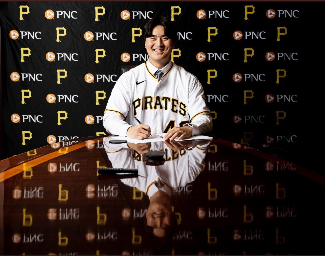 심준석이 6일 마이애미에서 방출됐다. MLB 도전 3시즌만에 방출의 아픔을 맛봤다. 2023년 피츠버그 입단식 당시 포즈를 취한 심준석. 사진|피츠버그 파이어리츠 소셜미디어 캡처