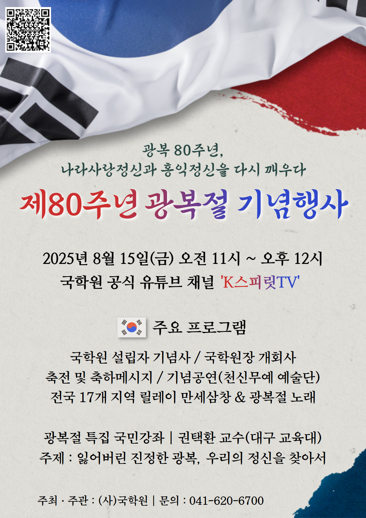 이어지는 2부에서는 광복절 특집 국민강좌도 열린다. ‘잃어버린 진정한 광복, 우리의 정신을 찾아서’라는 주제로 우리 민족의 정신적 가치와 역사적 의미를 되짚는 시간이다. 이 역시 K스피릿TV에서 시청 가능하다.