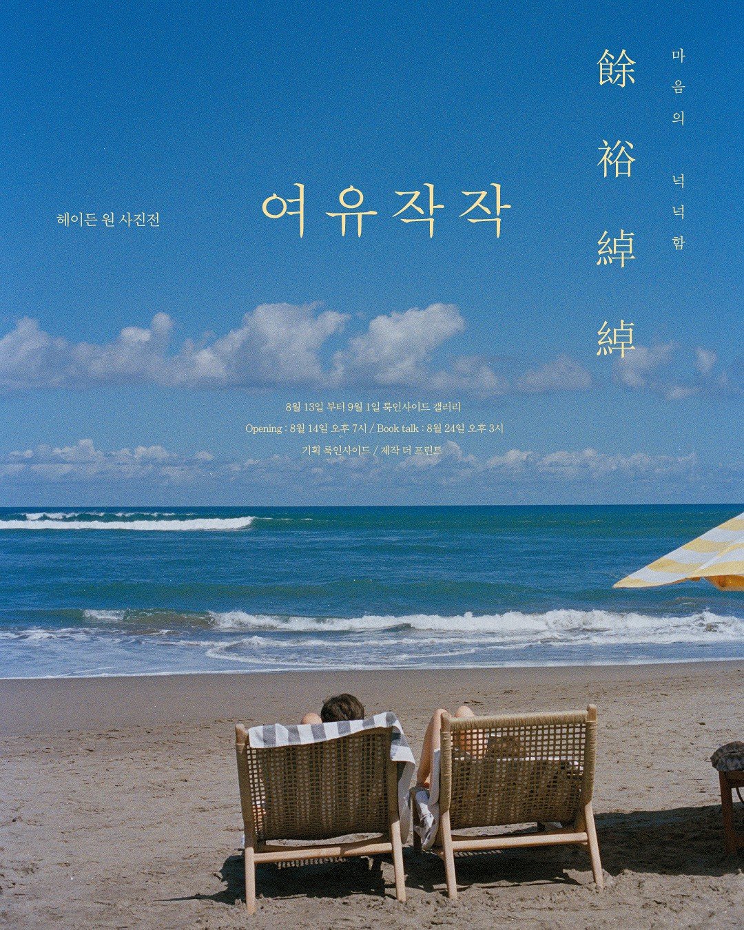 헤이든 원은 이번 책 출간과 함께 첫 번째 사진전도 연다. 8월 13일부터 9월 1일까지 강남구 신사동 가로수길에 위치한 사진 매체 전문 공간 ‘갤러리 룩 인사이드’에서 열린다. 전시회의 타이틀은 ‘여유작작’이다.전시된 작품은 모두 필름 카메라로 촬영됐다. 그는 “36컷의 선택이 우리의 삶을 대변하는 것 같다. 셔터를 누르는 찰나는 일종의 선택이며, 지나가는 모든 순간은 결국 여유로 연결된다”고 설명했다.
