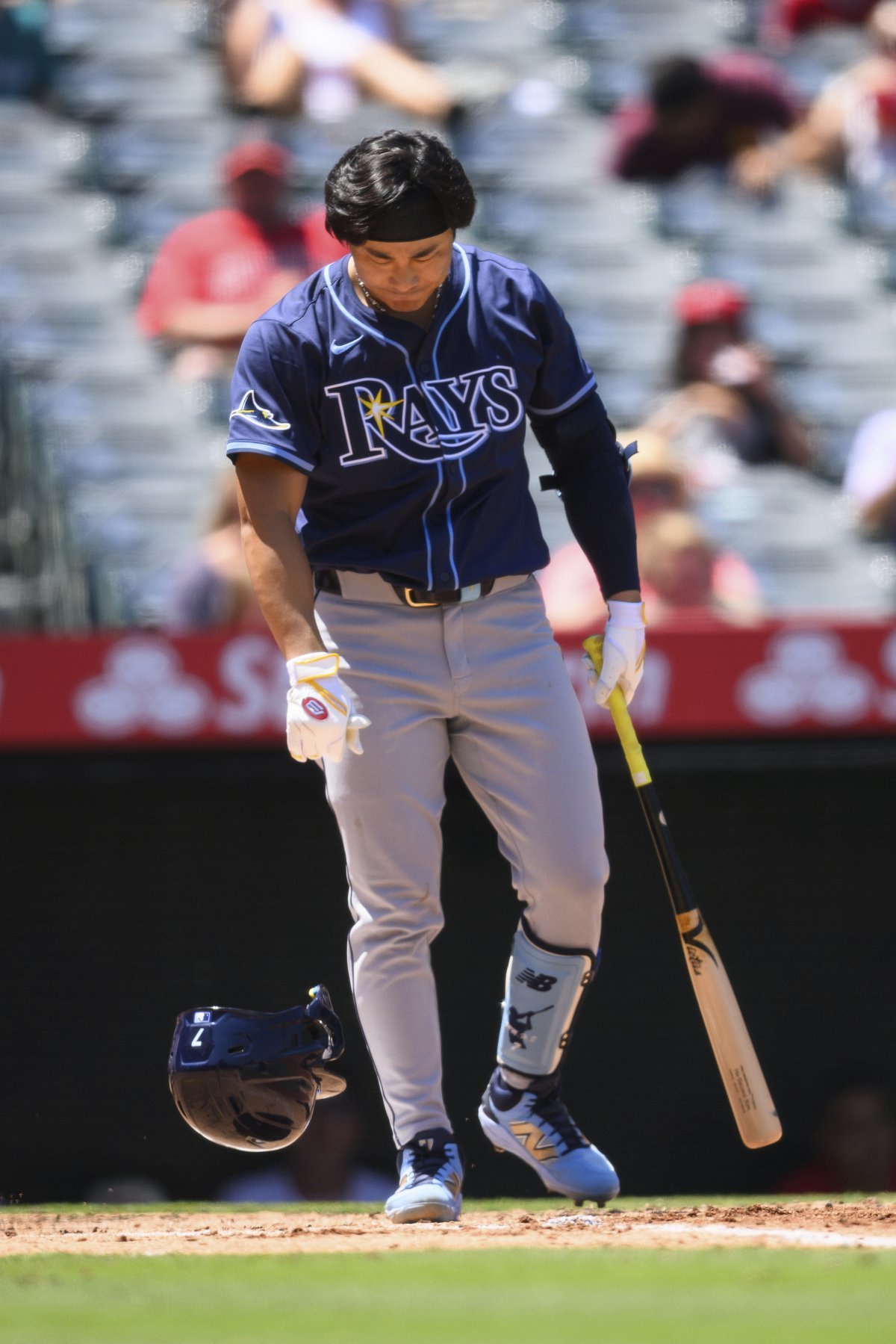 탬파베이 김하성이 7일(한국시간) 미국 캘리포니아주 애너하임의 에인절스타디움에서 열린 에인절스와 원정경기 3회초 헛스윙 삼진을 당한 뒤 헬멧을 떨어뜨리고 있다. 애너하임(미 캘리포니아주)|AP뉴시스